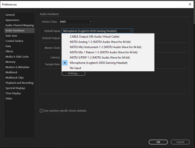 I have a Motu express interface as well as a virtual audio cable that shows up fine in the hardware section.
