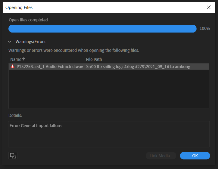 I have never seen this before and have never had problems with any of my footage from any of my cameras before. The files are not corrupt as they open and play OK within Premiere and other apps. I have already re-installed Audition but since there is no error code to look into, I am at a loss as to what to do next.