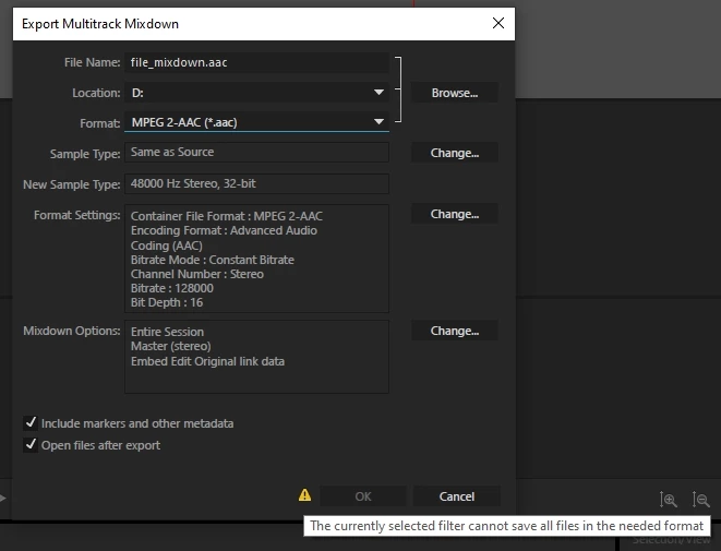 I get a message: "The currently selected filter cannot save all files in the needed format".