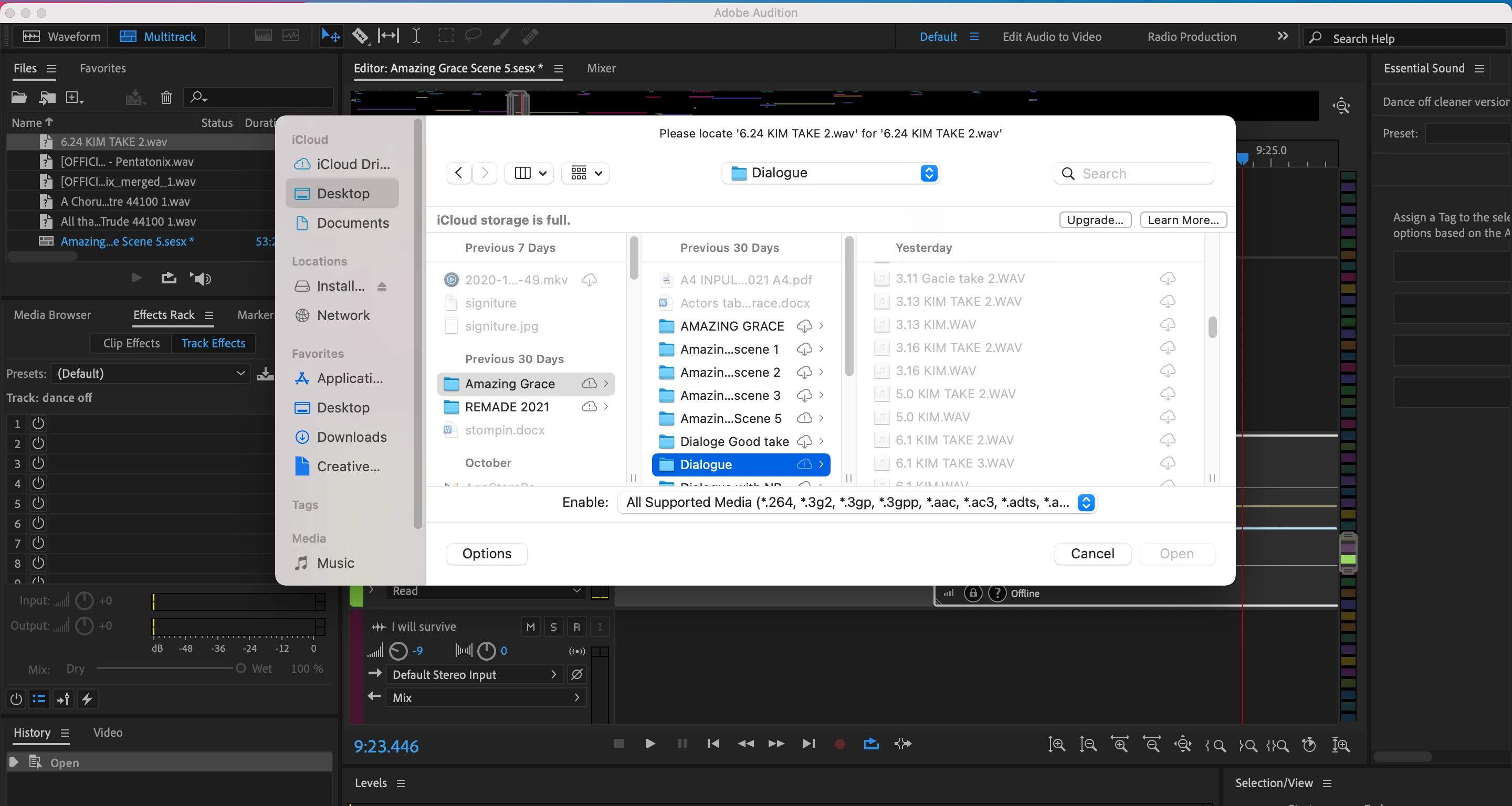 I opened up my multitrack project and my clips were offline. When I go to relink them the .wav file is visible but light grey and can't be selected.