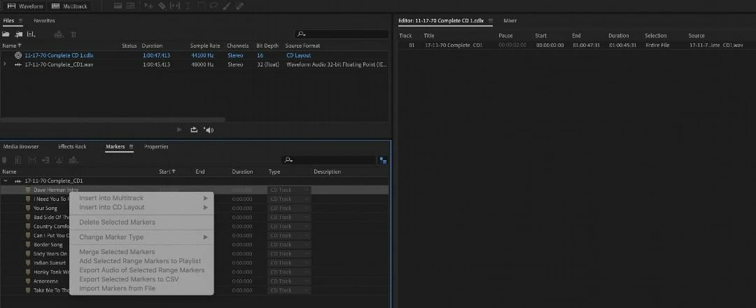 I have a 60-minute long wav file with a dozen or so markers in it. I can bring the wav file into my CD Layout, no problem. And I can see the individual "markered" titles in the Markers panel, but when I try and drag (or right-click) these marked files into the CD Layout, I am unable to. Nothing happens...and the "insert to CD layout" option is grayed out. I have tried changing the markers from CD Track to Cue, and nothing improves. Any thoughts?