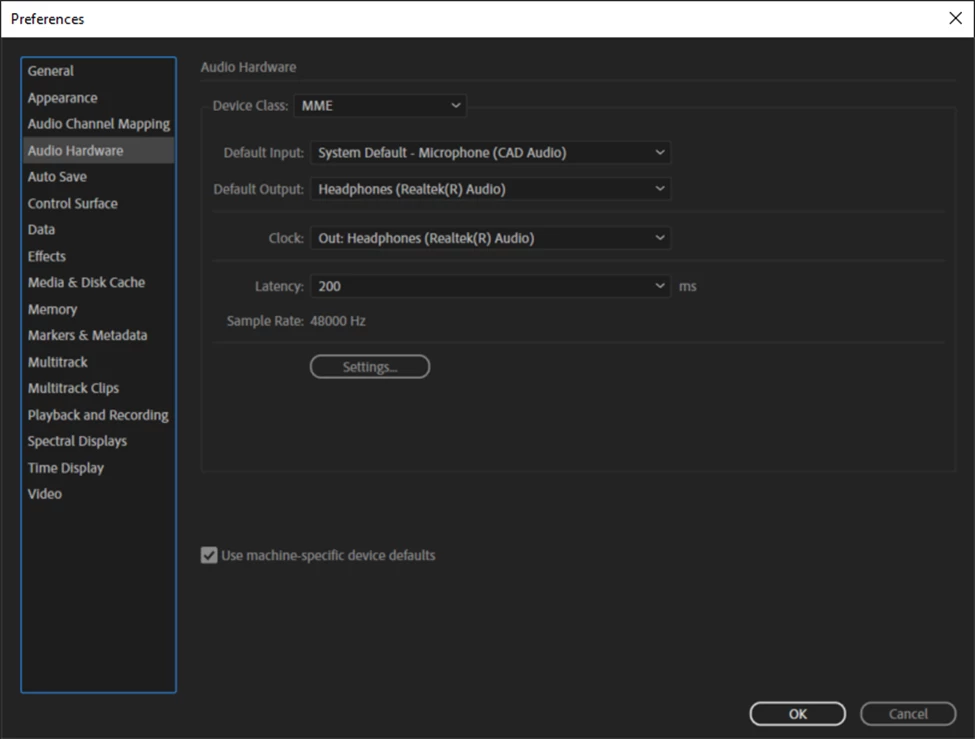 I have a Lenovo IdeaPad, Gaming 3 13IMH06 running Audition CC version 22.5. When I try to record through my CAD u37 I get choppy and echoing audio. I get the same results when I try to record using the laptop’s onboard mic. But when I record audio with my CAD mic on other applications, such as Audacity, it records fine. The CAD also records fine into Audition on my work machine. I’m running Windows 10 Version 21H2. Here is a screen shot of my hardware settings for Audition:
