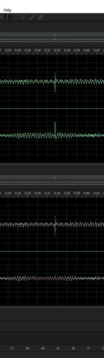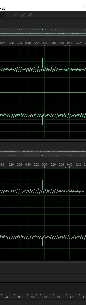 Picture 3 shows the original audio but this time with the channels reversed, so R becomes L and L becomes R. The theory here is, if the click/pop eliminator process thought the audio in the original right channel was not a click, now that the channels are reversed, processing should only occur on the left channel. Again, as with picture 1, this is prior to applying the click/pop eliminator, so both audio samples are identical.