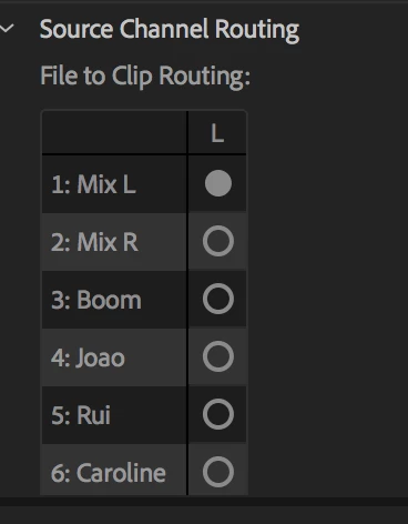 I went back in and found the source channel routing, which is very cool - would like that track info in PPro. But this is a clip by clip arrangement (i.e. I cannot modify multiple timeline clips)