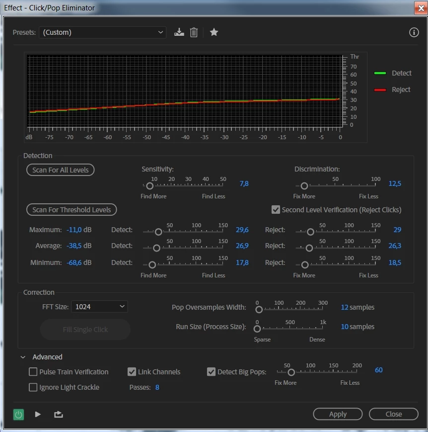In trying to salvage old stereo vinyls, I'm having a problem with the de-click process. After tayloring the process through the Click/Pop Eliminator window (see first screen shot), and applying it to the recording (FLAC files), I get a very satisfactory result for channel 2. Instead, Channel 1 is left unchanged, as if no processing at all had been applied to it (see the second screen shot). Could anyone help me to understand what I'm doing wrong?