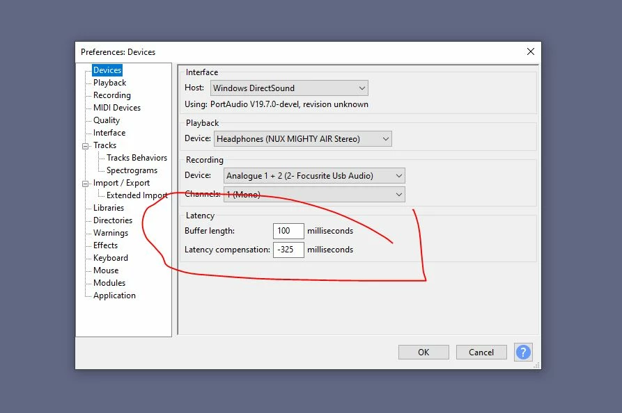 But i get the Latency, i am aware why its there. In audacity (a free recording app) there is a latency compensation which i set on -325 ms and it solved my problem. now the tracks match all the time when i listen again.