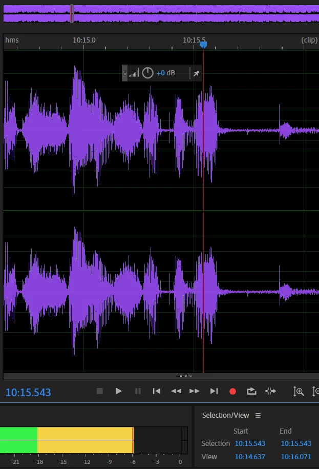 I do a podcast with my friend. The tool does a PERFECT job of editting his voice. But it continually cuts mine at parts that are NOT silent. At first, I thought my recording setting must just be off. But, as you see in the pictures provided, this is not the case. The first picture is the editted sound wav using the diagnostics tool. There was a spot where I said, "I got so sick of it." Audution cut the "of it" off because it picked it up as silence. However, in the second picture, you'll see the uneditted version and the db level. The part that it cut out and picked up as "silence" is at -6ish dB, i.e. WAY above the range that should be considered silence. Why did it pick this up as silence and how do I fix this?