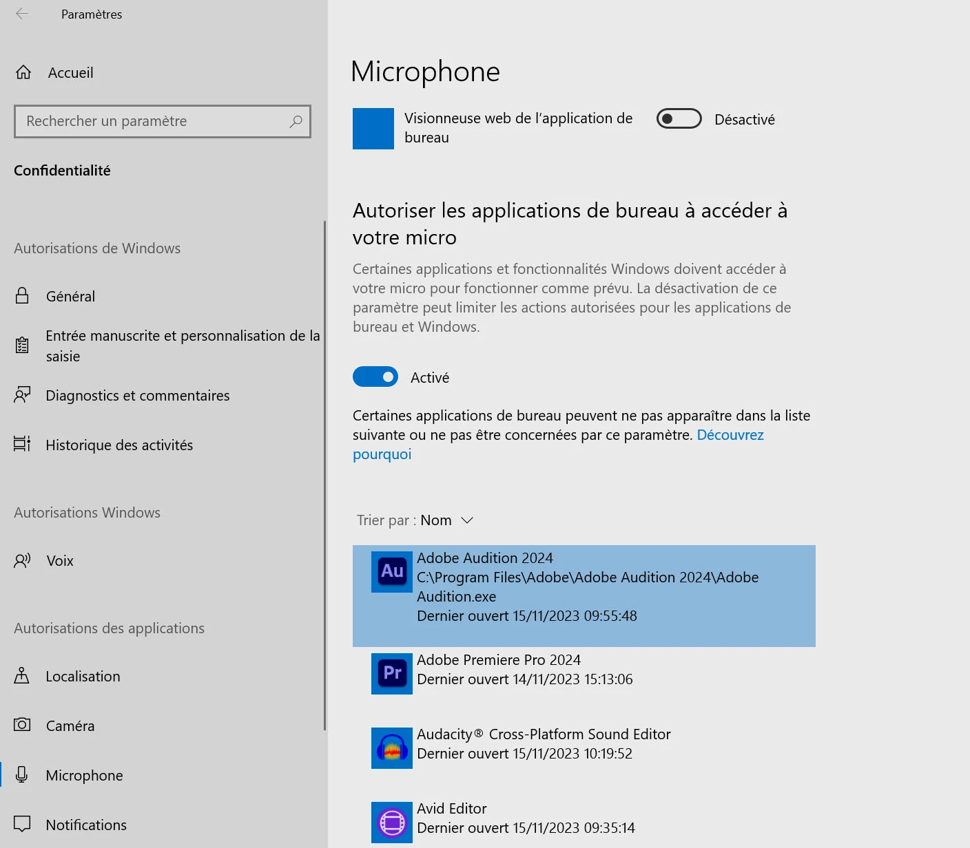 je rencontre un problème d'enregistrement de voix dans Adobe Audition. J'utilise la dernière version du logciel avec une carte son externe Focusrite et un micro branché en XLR. Le niveau sur la carte son module bien, le mixer audio de windows confirme que le son entre bien dans l'ordinateur. J'ai testé avec l'enregsitreur windows et ça fonctionne. Pourtant dans audition aucun son ne rentre ni n'est enregistré. J'ai vérifié la configuration du matériel audio et tout est bon. Est-ce que quelqu'un a déjà eu ce problème et a pu le résoudre?