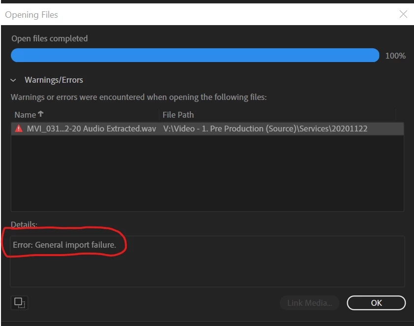 1) mark an in and out point on the audio that is failing to be imported