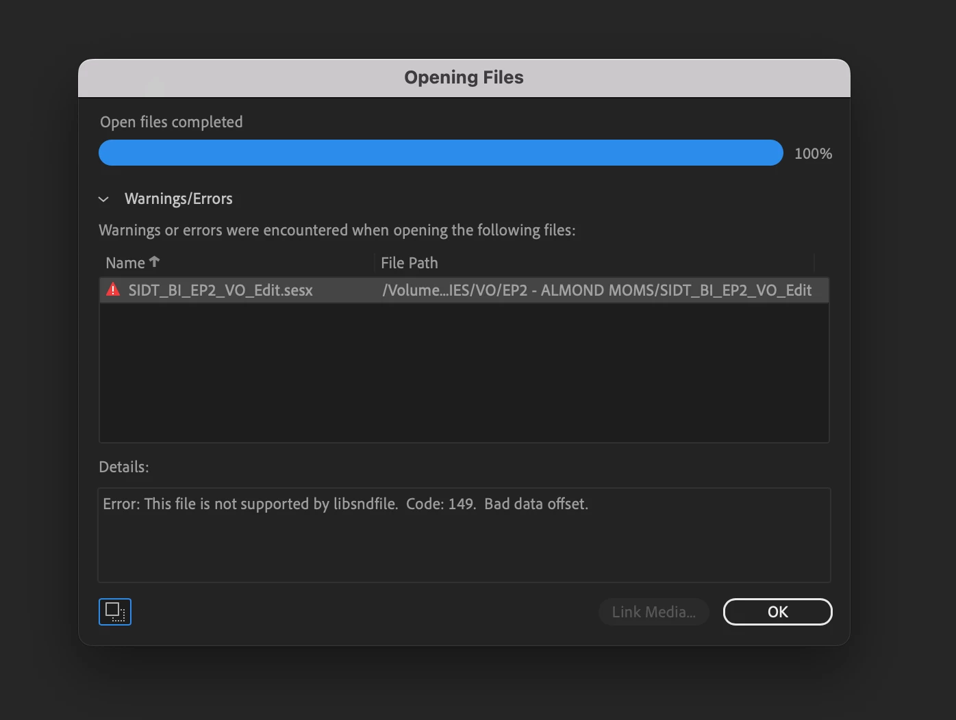 The error message is "Error. This file is not supported by libsndfile. Code: 149. Bad data offset"