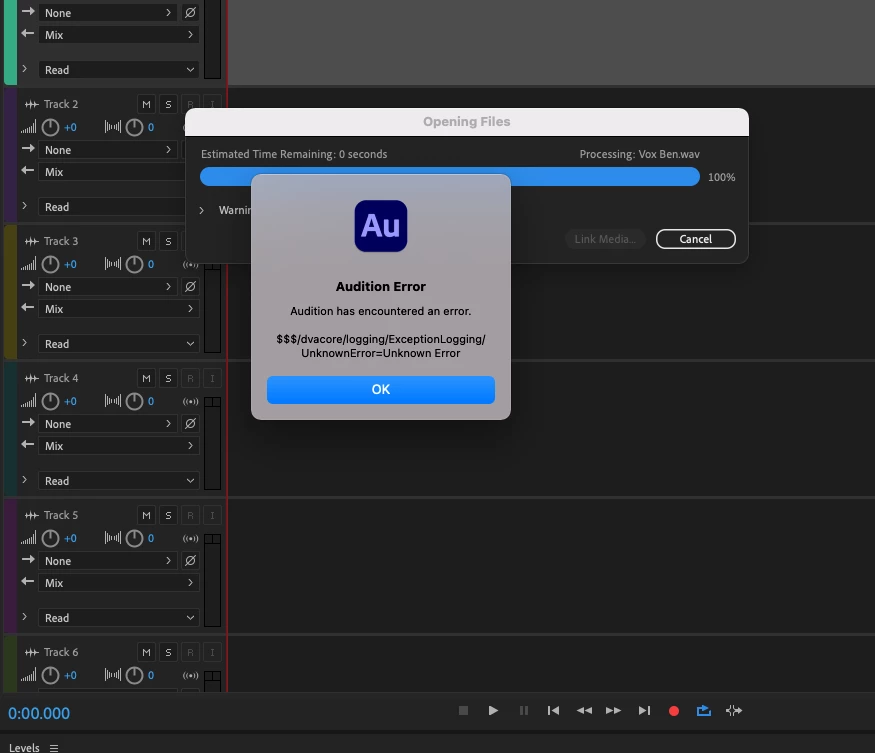 no matter what file I try to open (Audio file, session file) - even if i create a new file the error occurs. it occiurs on ALL my devices (macbook pro, mac pro).