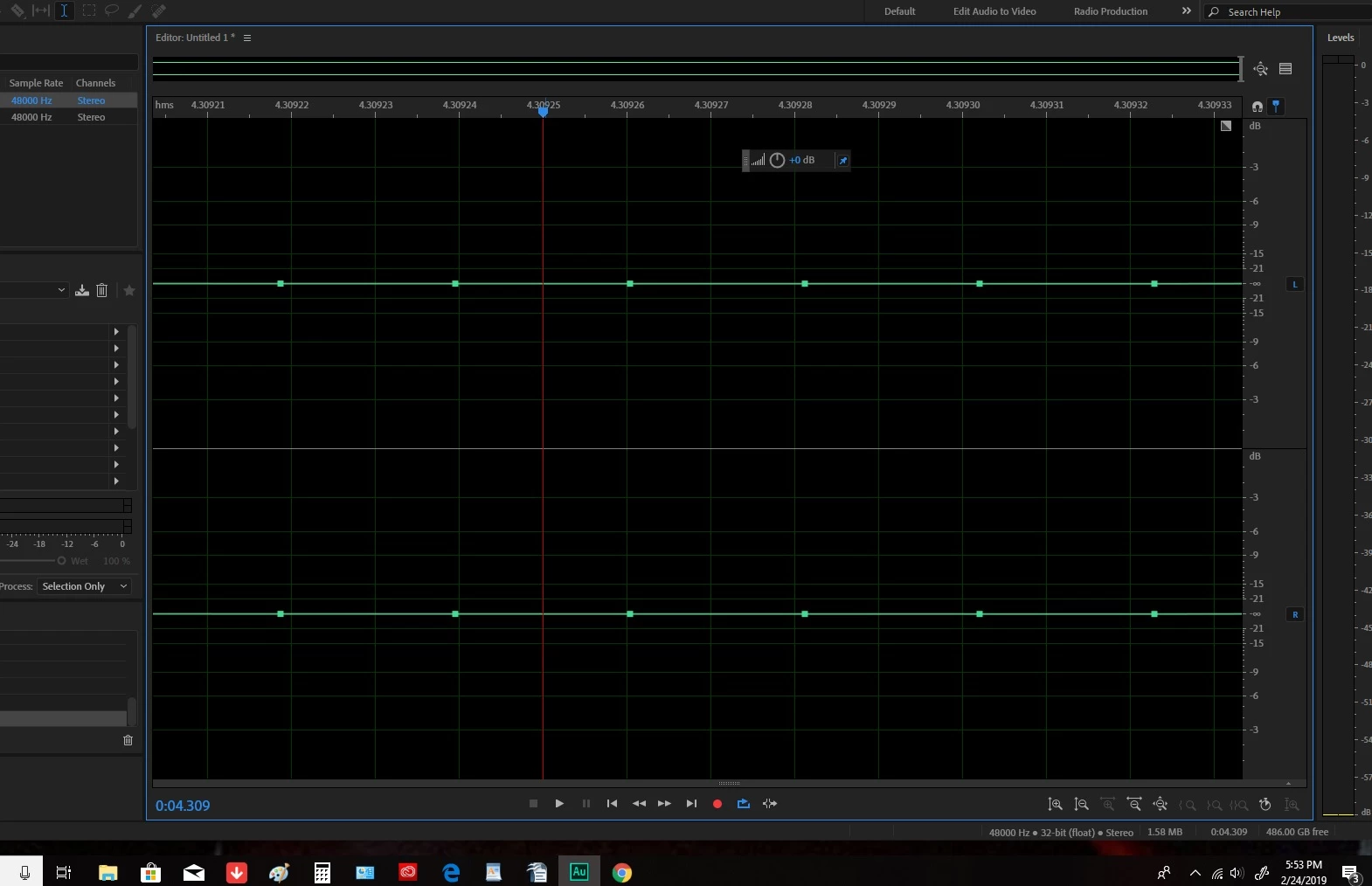Okay here it is, the green line-with-boxes-squares-going-through-thing. I did find out that it is actually recording. I thought it was just a bug but it is recording because after I hit stop I accidentally hit the spacebar and I could hear my voice saying "oh there's the green boxes." Usually I just hit delete and it clears it and then I hit record and usually it begins the normal waveform. But recently sometimes I have to delete the green lines with boxes two or three times to get a recordable screen.