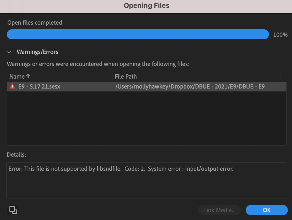 HELP "Error: This file is not supported by libsndfile. Code: 2. System error : Input/output error."