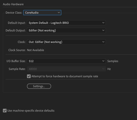 Reviewing the suggestions in this thread: https://community.adobe.com/t5/audition-discussions/audition-will-not-play-on-mac-pro/m-p/10309355#M16059 … made sure "Attempt to fore hardware to dfocument sample rate" is checked, and i've turned on and off the Use machine-specific device defaults.