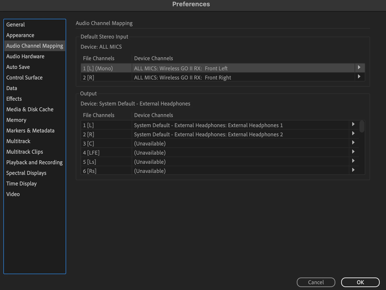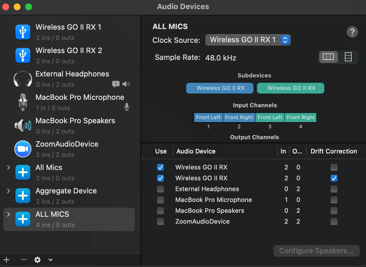 So, I have a set-up of two RODE Wireless Go receivers (each has two audio channels). They both plug into my Mac via USB. I have set them both up in an aggregate device and set that as the device in Audition: