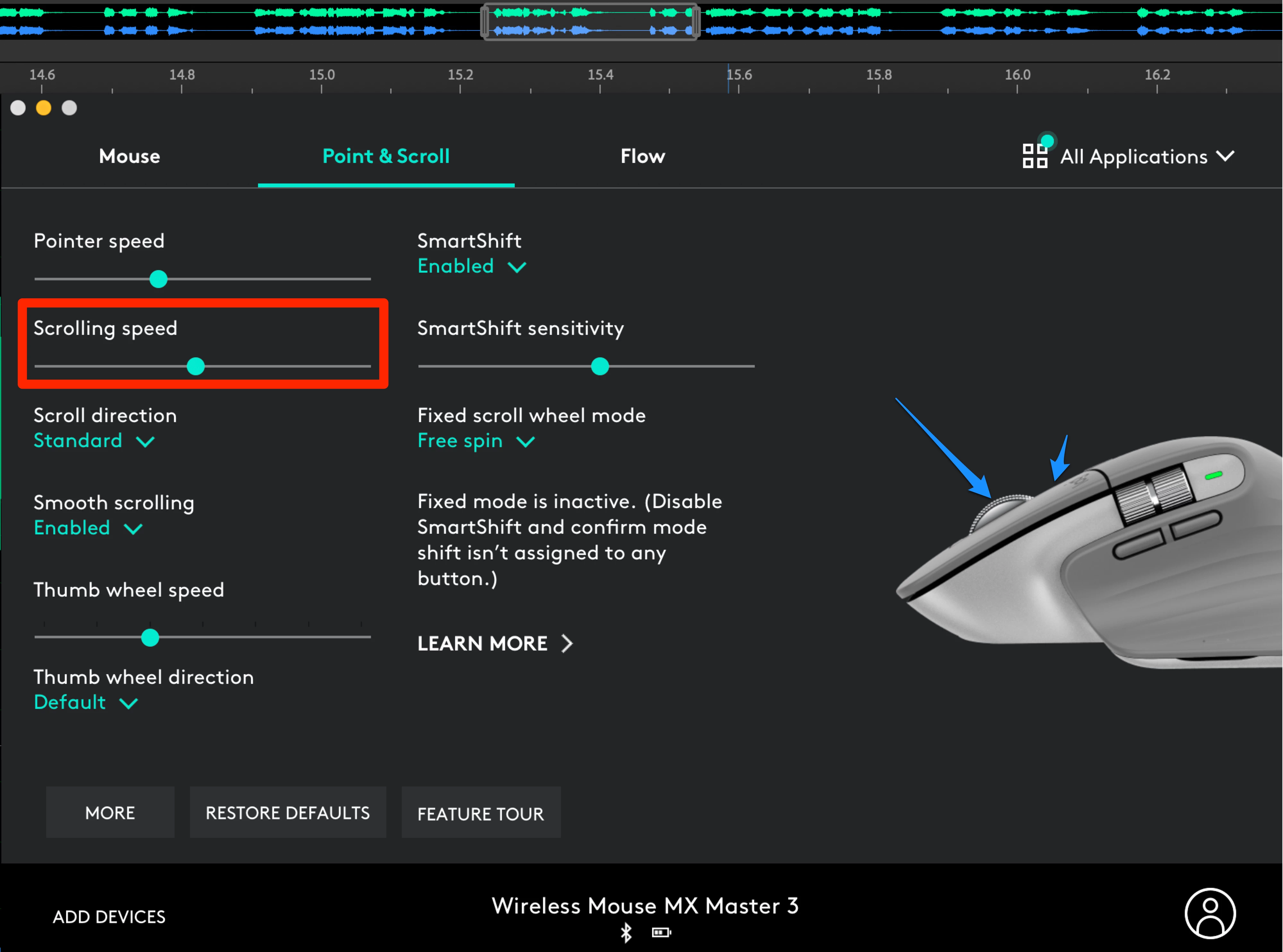 I get it. When zoomed in and scrolling horizontally in the waveform view (either using a scroll wheel that supports horizontal scrolling or by holding SHIFT while scrolling up/down) you would like the step size for each "click" of the wheel to be larger so that you can scroll more quickly. There's no preference for this at this time, though I'll be happy to put in a feature request to accomodate this. As a workaround for now, you can click on either side of the orange "view" box in the waveform preview above the ruler, or grab the orange box and drag it where you would like to view more quickly.