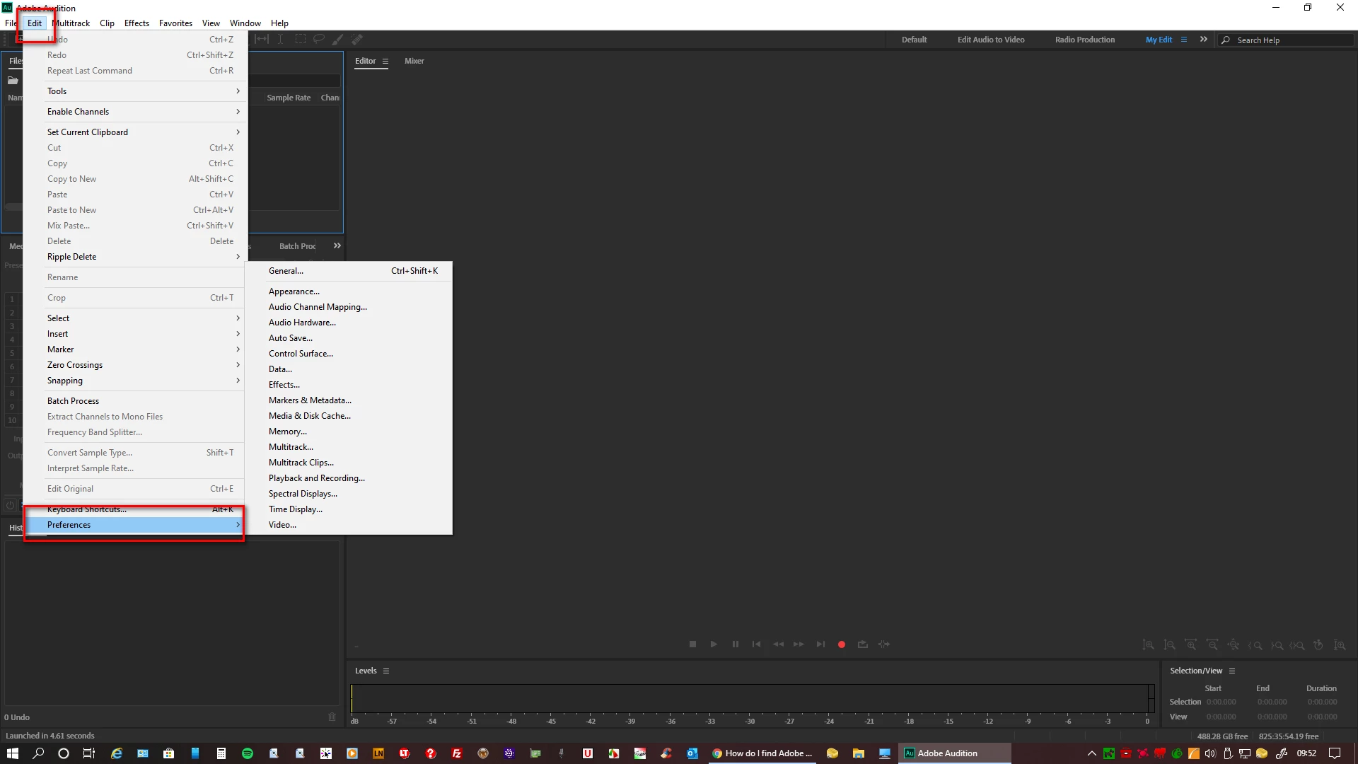 The Audition tutorials say to find Preferences (for audio input, etc.) under the "Adobe Audition CC" tab. I can see it next to the Apple in the tutorial vid. But I'm on Windows and the tab is not there! Where do I find it and how can I get it to the top menu bar so it's easily accesible?