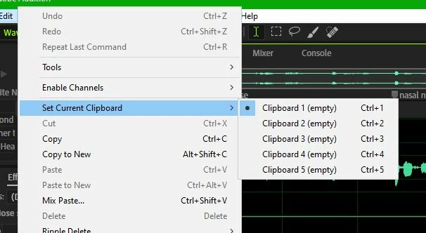 I am having trouble with Audition's copy/paste/clipboard system. I use Audition to edit audio for audiobooks, and one of the things I have to do is copy and paste room tone over noisy or unwanted sections. The process looks like this (this is all done in Waveform Editor on .wav files): 1) I copy my room tone track (which is one second long), 2) select the unwanted portion in the audiobook track, 3) cut the selected portion, 4) and paste from my clipboard. The problem is that when I select and cut the unwanted portion, Audition copies that selection to my clipboard (!) and I end up pasting what I just deleted. My temporary solution has been to switch to the room tone track and copy the room tone after every time I select and cut the unwanted portions, but this is taking way too many clicks. Is there any way to disable this feature? Is there a workaround/shortcut that I can setup to cut down on my clicks?