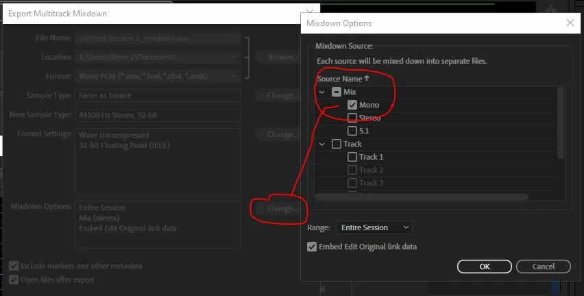 When attempting to export multitrack mixdowns I'm unable to select for mono files. I've tried to change the files to mono in the 'convert sample type' window in the export multitrack mixdown tool but it always reverts to stereo. I've tried to work around this in multiple ways but I'm still getting all stereo files. What am I missing? Most DAW's have quick ways of making multitrack bounces of mono tracks, as it's something you do often if you want to move your sessions to different DAW's/studios for mixing. Whats up with Audition? Any help is appreciated.