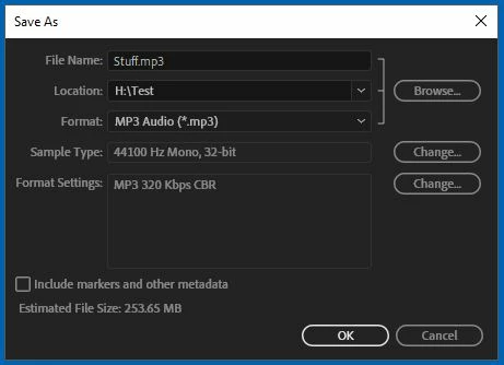 Hi, I'm using Audition CC 11, in the "Audio File" mode. I want to do something that I think should be really simple, which is to save a copy of the current WAV file I am working on as an MP3. The best way I've found to do that is File > Export > File, but that defaults to appending a "_01" suffix to the file name of the MP3 file. For example, if the file I am working on is "Song.WAV" and I export, I get "Song_01.mp3".