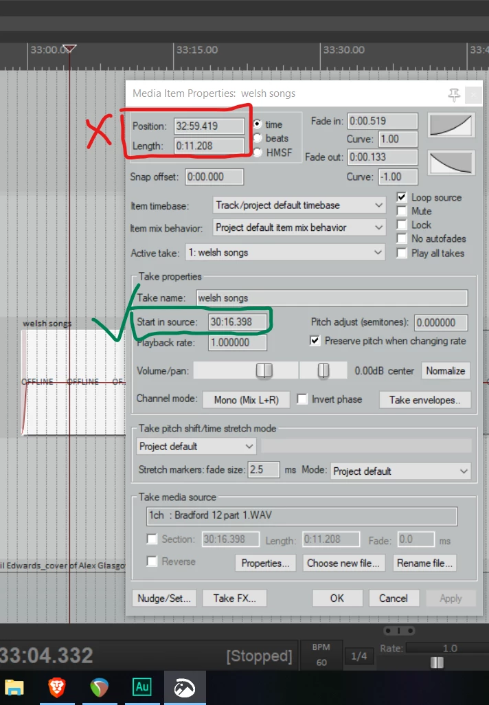 You can do this is Reaper by opening up clip properties (called media item properties in Reaper). See Reaper screenshot attached. Is there a way to do this (find the green boxed time) in Audition? The clip properties panel shows me the session start and end times, but not the source media start time.