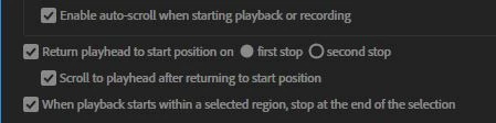 When I play a selected area of a waveform, the playhead either continues past the end of the selection area, or if the selection is that the end of the file, the playhead jumps to the start of the file after playing. I would like to have it loop within the selection area. I have "Return playhead to start position" unchecked in Prefs, and also have it unchecked in the Play button menu. Could anyone please tell me how to set this up in Audition? Thank you for your help!