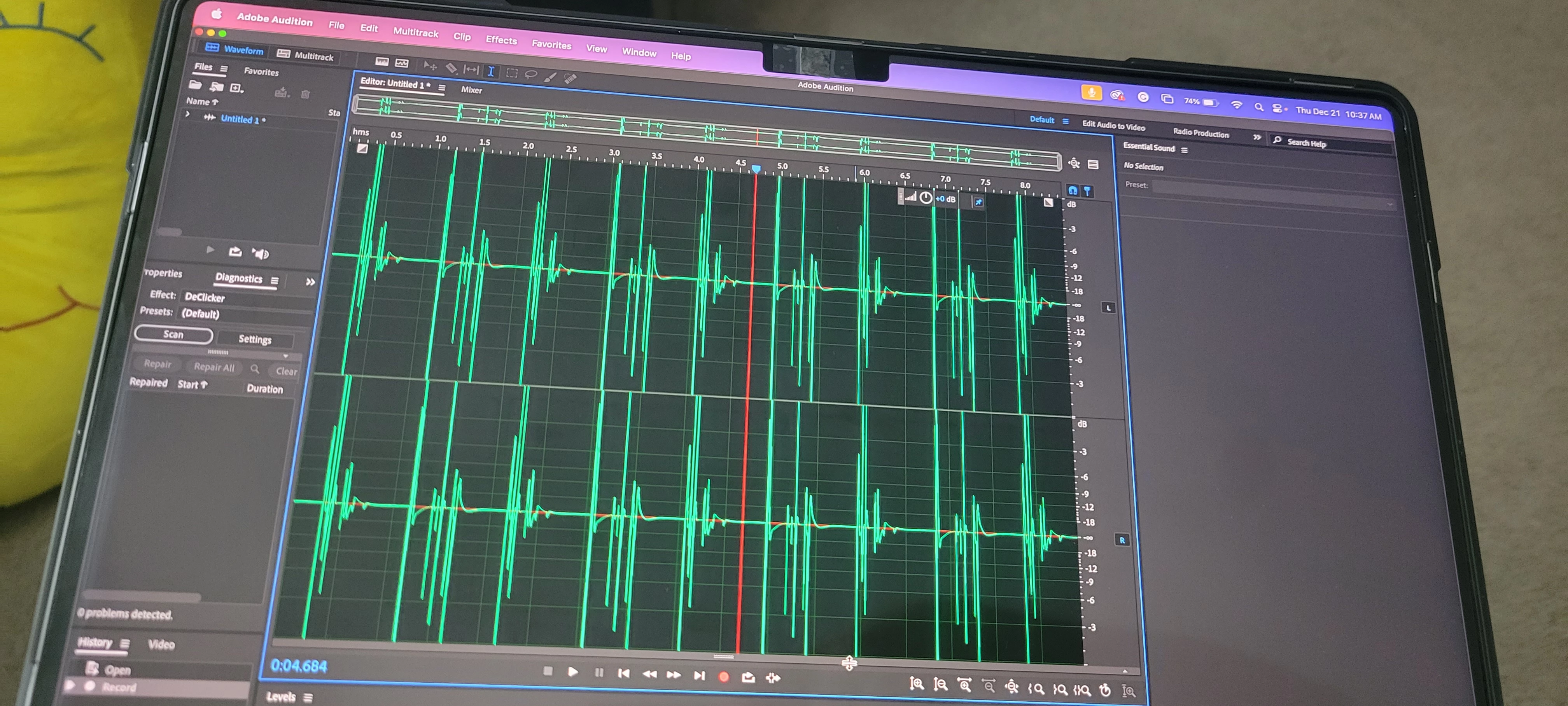 I am a beginner and I am trying to record my paino and have all the set up correct and can record sound, however there are loud cracks. And they are happening even when I am not playing any notes on the piano. Could it be the cord I am recording with? Any help please! Attached photo is a recording of silence.