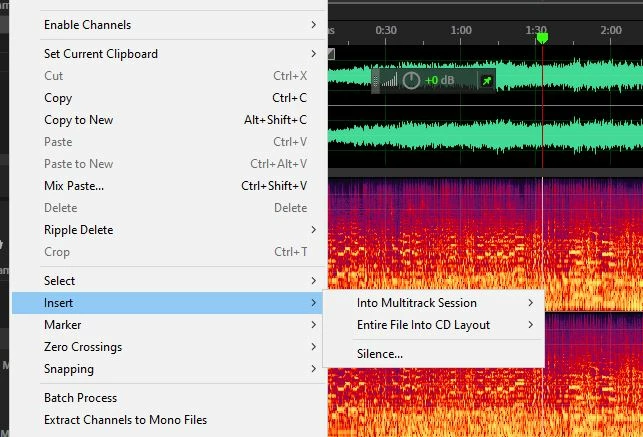 In classroom in a Book Audition CC Second Edition, Lesson 3 - Cut Copy Paste, position 1415 - I want to "choose Edit > Insert > Silence". But the menu-item 'insert' is grayed out. Only 'insert and mix' is available.