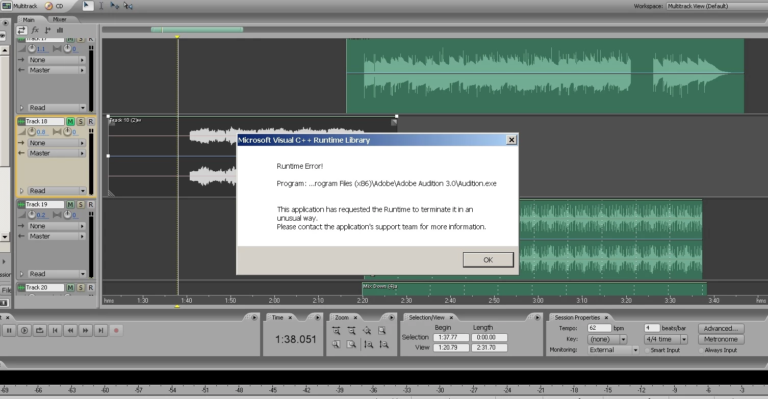 I purchased Adobe Audition 3.0 a couple of months back for my Windows 7 laptop and overall I enjoy it. When it works, it works great. However, I have encountered a "Microsoft Visual C++ Runtime error" at least three time which prevents me from being able to continue with a session.