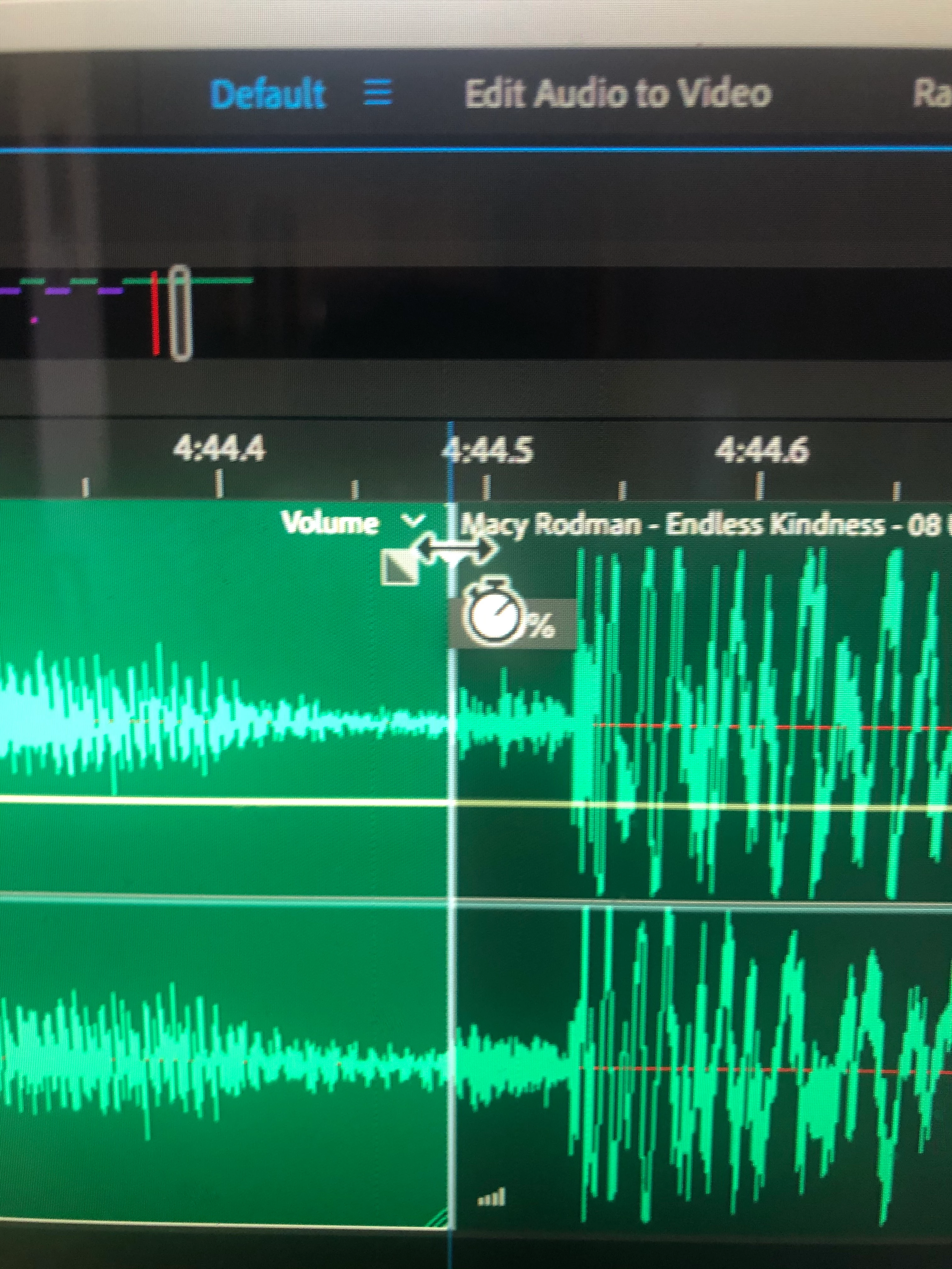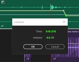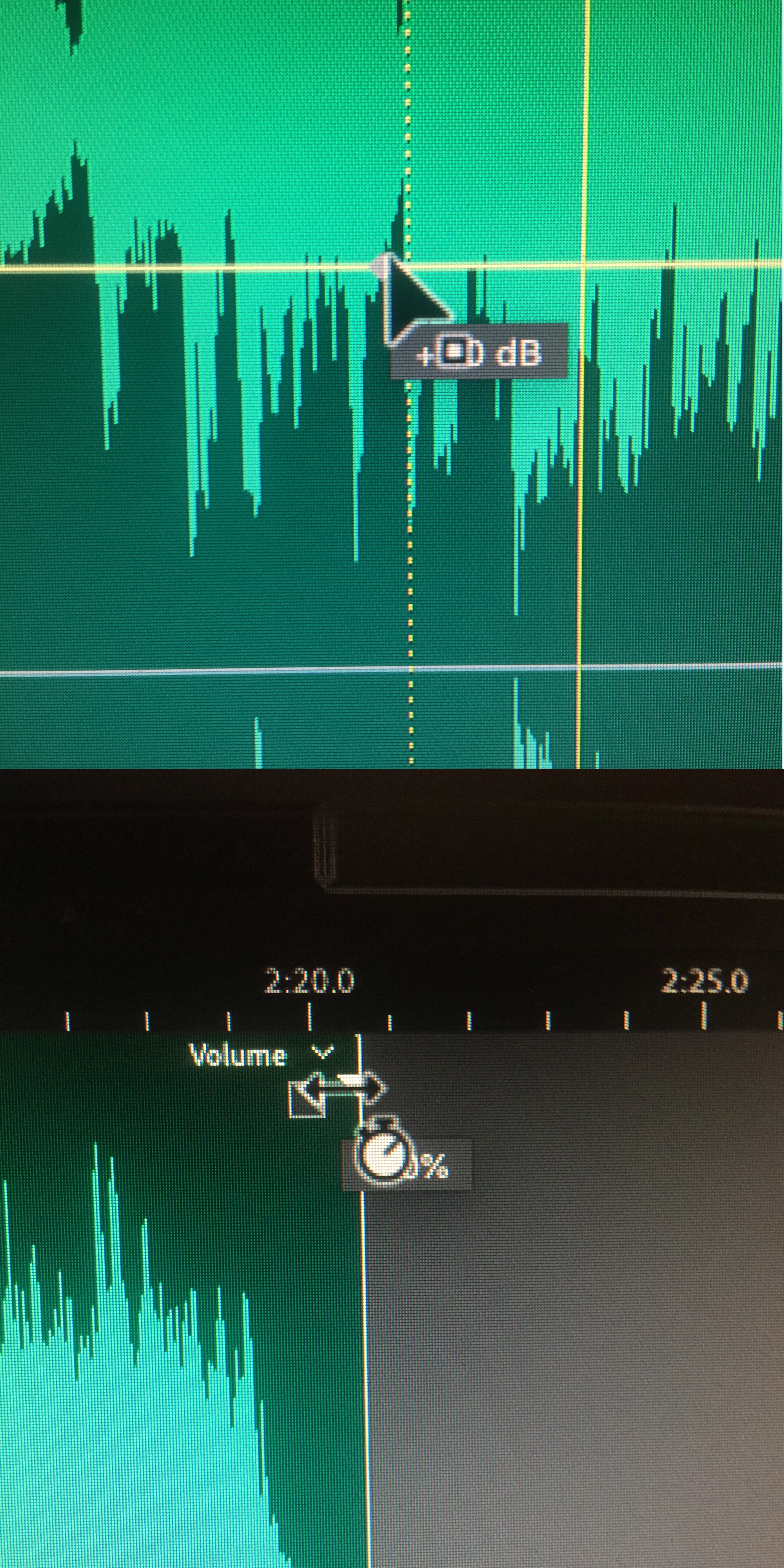 In Audition 2020 v. 13.0.2.35, I have an annoying problem. When I click on a multitrack keyframe to alter volume, a small icon below the cursor hides the decibel level. [Attachment, top image]