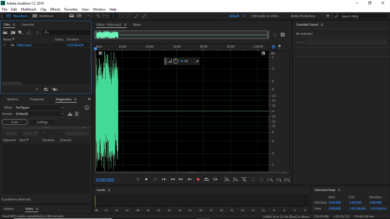 So for my podcast I interviewed someone on skype. At the end of the recording I played it back in Skype and the whole hour was there. Now when I saved it and opened it up in Audition CC, the audio stops after like 8 minutes. So basically for the first 8 minutes there is audio and waves and for the rest of the 52 minutes there is silence and no waves. I have no clue what I am doing wrong and I did convert it from an MP4 to and MP3. Here is a photo of what it looks like. Can I get some help? .png)