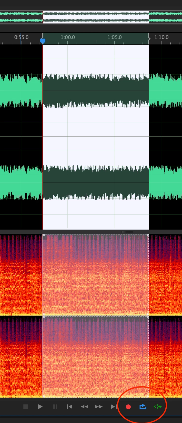 - Select the area of music you think you want to cut out, then turn on Loop Playback and Skip Selection (the blue and green buttons in my screenshot below, respectively). Skip Selection will let you hear a few seconds before your selected area and then immediately a few seconds after, as if the selected part was already deleted. You can then adjust the selection as needed on either end until you hear a smooth transition between the part before and after the selection. Loop Playback just replays that section over and over again while you adjust so that you don't have to keep hitting the Spacebar or the Play button.