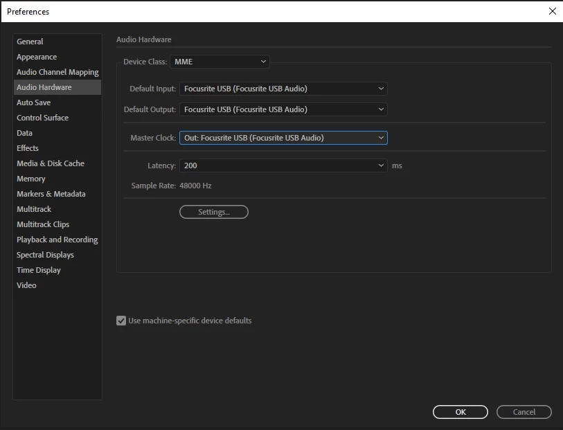 Before we go any further, can I suggest that you work carefully through Focusrite's page on how to set up a 2i2 for use with Audition? Yes, they really do have a page about that... Set up Focusrite for Audition. Please note that this uses ASIO, and it's a good idea to switch to that anyway.