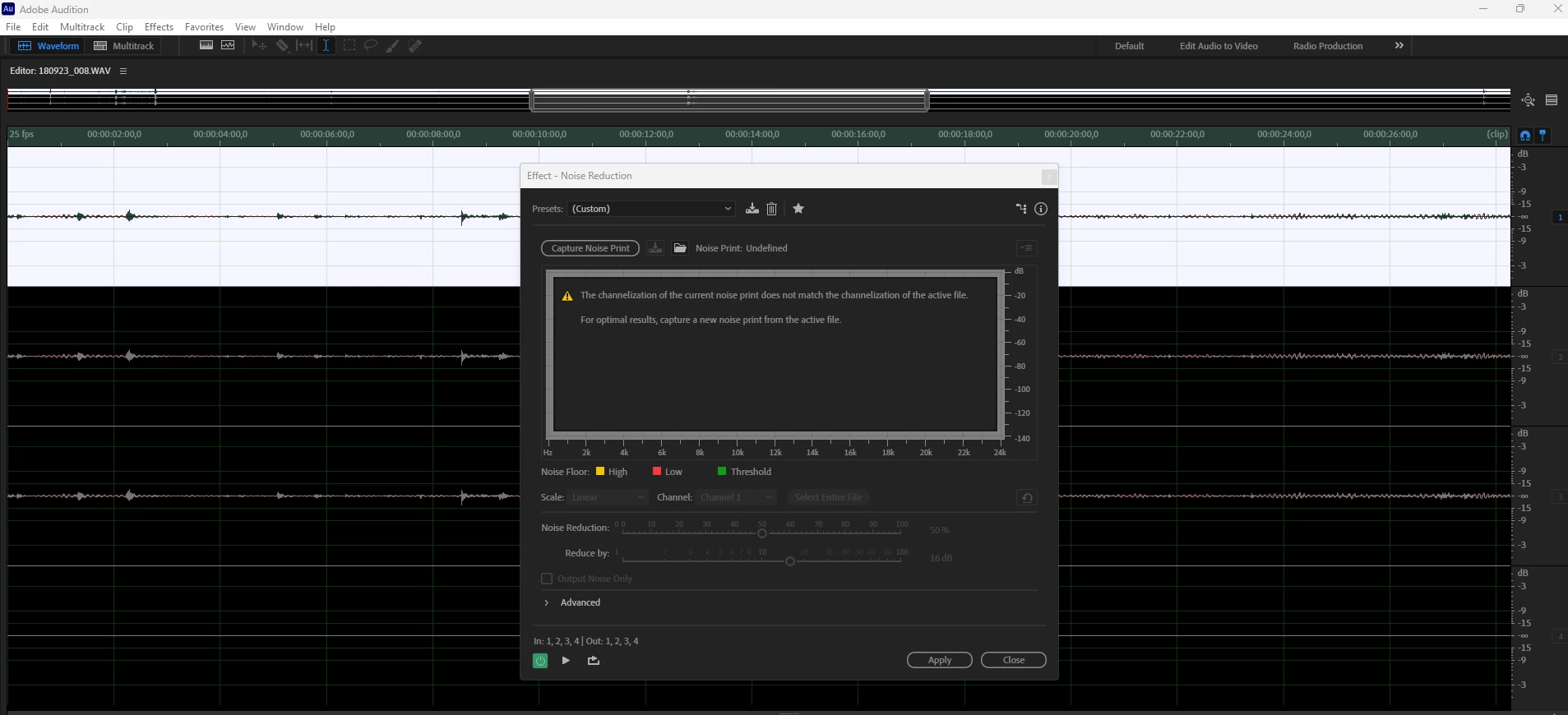 Hi everyone, I'm trying to clean some audio files for a short video I've made, we record with a F6 and the sound engeneer has recorded the tracks in a multichannels file, the problem is that when I try to open a file from the multitrack to the waveform to clean it up it show me this message on the noise rediction panel: "The channelization of the current noise print does not match the channelization of the active file. For optimal result, capture a new noise print from the active file".