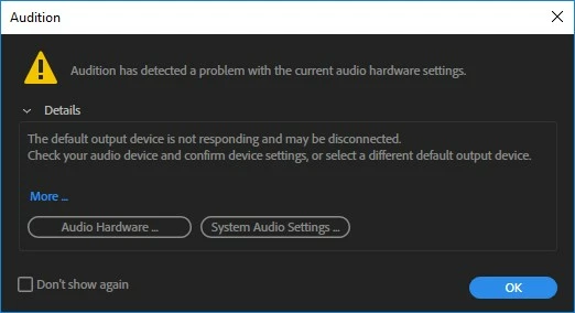 My installation of Adobe Audition CC (build 11.1.1.3) on Windows 10 mostly behaves itself, but after I do a multitrack mixdown it becomes confused. When I try to play anything (the session or the mixed-down WAV file) after the mixdown, I get the error message, "Audition has detected a problem with the current audio hardware settings. The default output device is not responding and may be disconnect." (See below.) The weird thing is that nothing has changed. All I've done is mixed down a session.