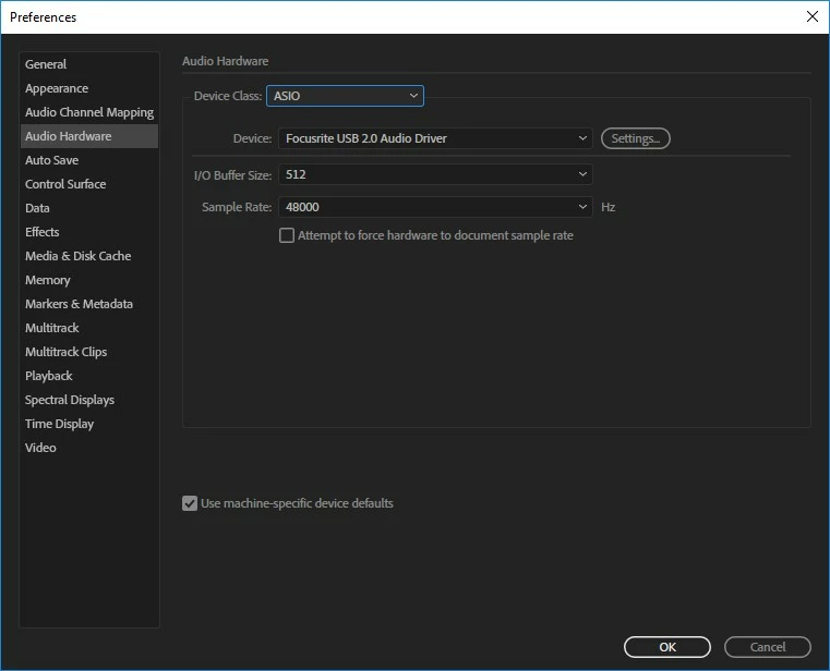 My audio hardware is a Focusrite USB 2.0 device and I'm using its ASIO driver.