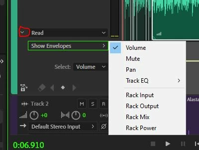 I am working on a multitrack file. It's got one stereo piano track and 4 vocal tracks (mono) in it. I can adjust the pan for any single voice for the whole duration in wither the mixer or the track controls. But I cannot see the blue line of rht pan envelope!