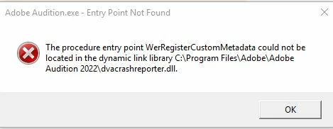 Procedure entry point could not be located, unable to open adobe audition