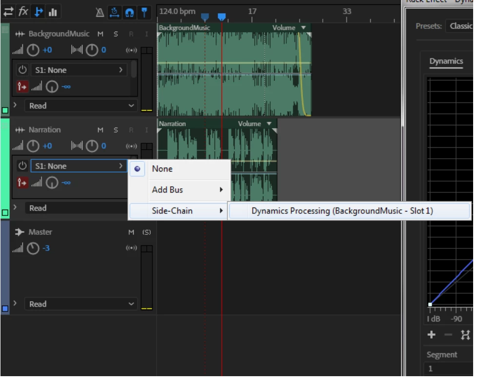 my homework was confusing me quite a bit, and i was hoping someone here could help me. I added the dynamic processing to background music, but i cant figure out how to sidechain it to narration. side chain just isnt an option available for me. when looking at the picture that was provided in my homework, i noticed some differences. in the provided pictue, theres is the option to toggle the side track, but i dont have that option. please help me understand what i did wrong.