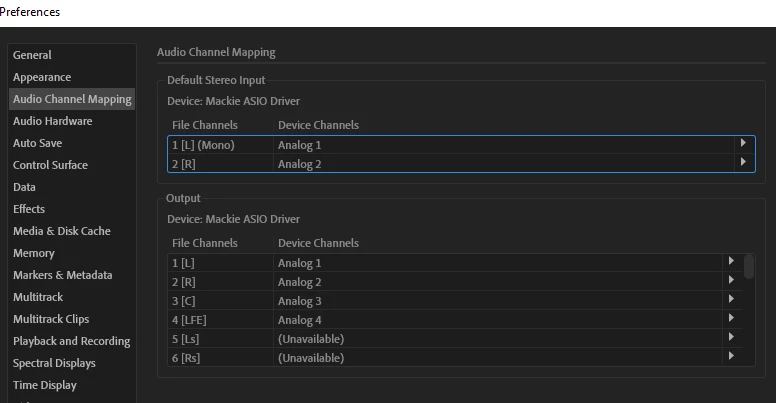 In Audition I setup the audio hardware as Device Class: ASIO and Device: Mackie ASIO Driver. Under Audio Channel Mapping (also see attached picture) I have L1 as Analog 1 and R2 as Analog 2. For testing purposes I created a multitrack session and set Track 1 as L1 and Track 2 as R2 as mono inputs. I'm not getting any waveforms or indication that audio is coming in when recording a test track with the microphone. As another test I switched to MME to see if the analog mic input to the sound card was working and it does record and playback.