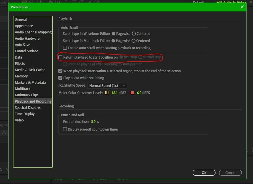 I have read posts referring to this issue but still am having problems with the reccomended fix. What / where is the setting for returning the playhead to the starting position by spacebar? I am using the latest edition of Audition CC and, for the life of me, can't find where to set this.