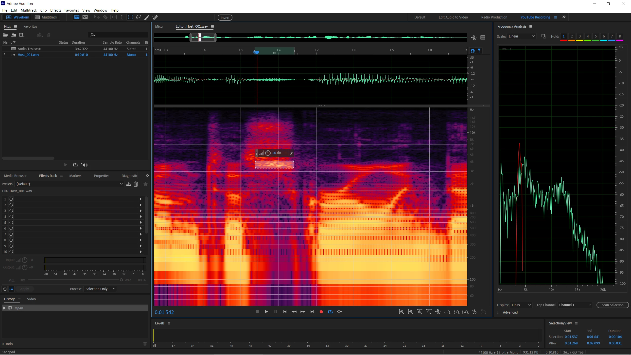 My first step was identifying an "S" sound using the Waveform and Spectral Frequency. The very first example is when I say the "S" in "Scrolling Down the Belt", very close to the beginning. I isolated the "S" sound using Spectral Frequency and the Marquee Selector Tool to where I could hear only it. And if I understood the video correctly, I was really looking for parts that showed up as orange on the heat map. While it maybe wasn't as obvious to me as it was on the example in the video, I think I managed to locate such a spot: