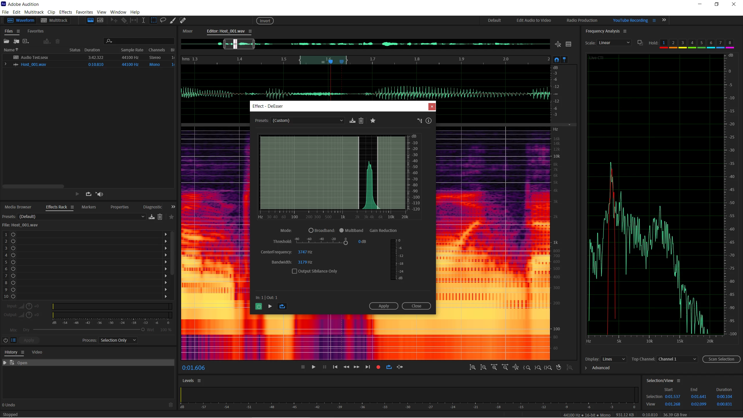 With this, I opened up DeEsser and entered 3747 as my CenterFrequency, with a default value of 3179 Hz as my Bandwidth. Given that the spike in the last screenshot was somewhere between -35 and -40 dB, and I seemed to have a similar spike within my range on the waveform in the DeEsser, I figured I had the range about right. This is what my waveform looked like in DeEsser with just the highlighted clip playing: