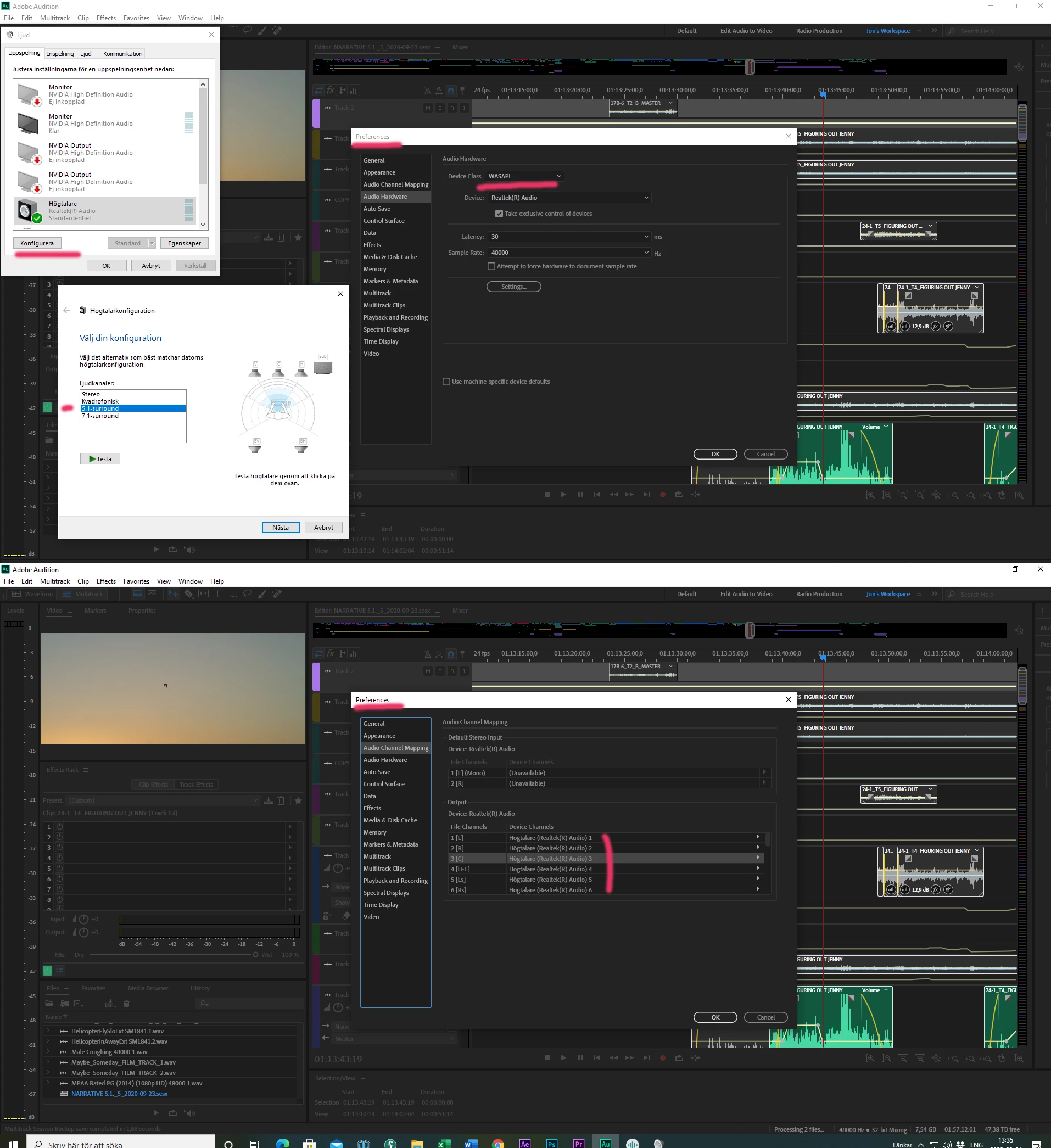 I'm hoping to listen to a 5.1 mix using passive monitors. I have optical cable running from my computer to a receiver. I can play 5.1 material, but not from Adobe Audition. I'm only given 2 channel mapping options. Does anyone have a work-around for this?
