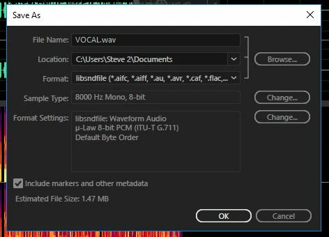 I recorded some "On-Hold" messages for our phone system which I produced the finals in Audition CC. Unfortunately it ends up that the phone system (Avaya) requires a specific recording type and I'm not figuring out an export scheme to match what it requires.