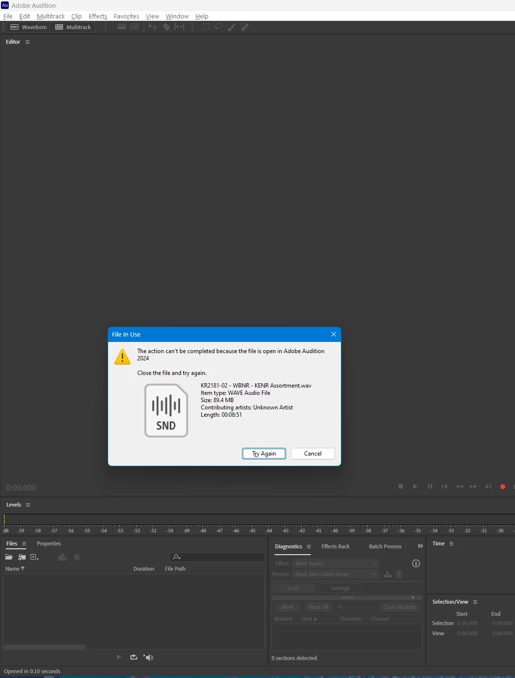 The last file closed in Audition 24.4.1.3 stays locked in Windows 11 unless you open another file