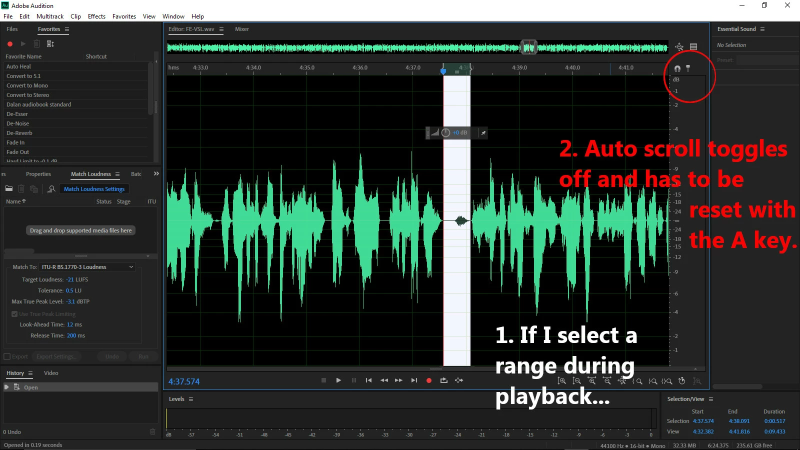 So basically, I edit audiobooks and podcasts, and up till now I have enjoyed the ability to play the audio and edit it in real time. I can let the audio play, select problem breaths or other issues, and deal with them as the audio continues to roll. This ability is unique to this DAW, as far as I know, which is why I love Audition. But since I updated to v12.1.1.142, when I select any range, the auto-scroll key toggles off and the cursor keeps merrily moving off the screen. I can punch A to toggle the auto scroll back on, but this is an extra step and it takes focus from the next potential issue to fix.