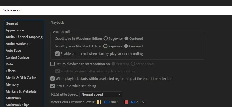 I don't know if this issue is related to the update, or to some setting that changed when I updated. (I had to delete everything and start over from scratch due to issues with the reinstall.) Does anyone have any ideas? Is there a way to make Audition default to auto scroll and not toggle auto scroll when I select a range? EDIT: Setting it to center the cursor in the screen doesn't solve the issue because the waveform moves too quickly for me to edit effectively in that view.