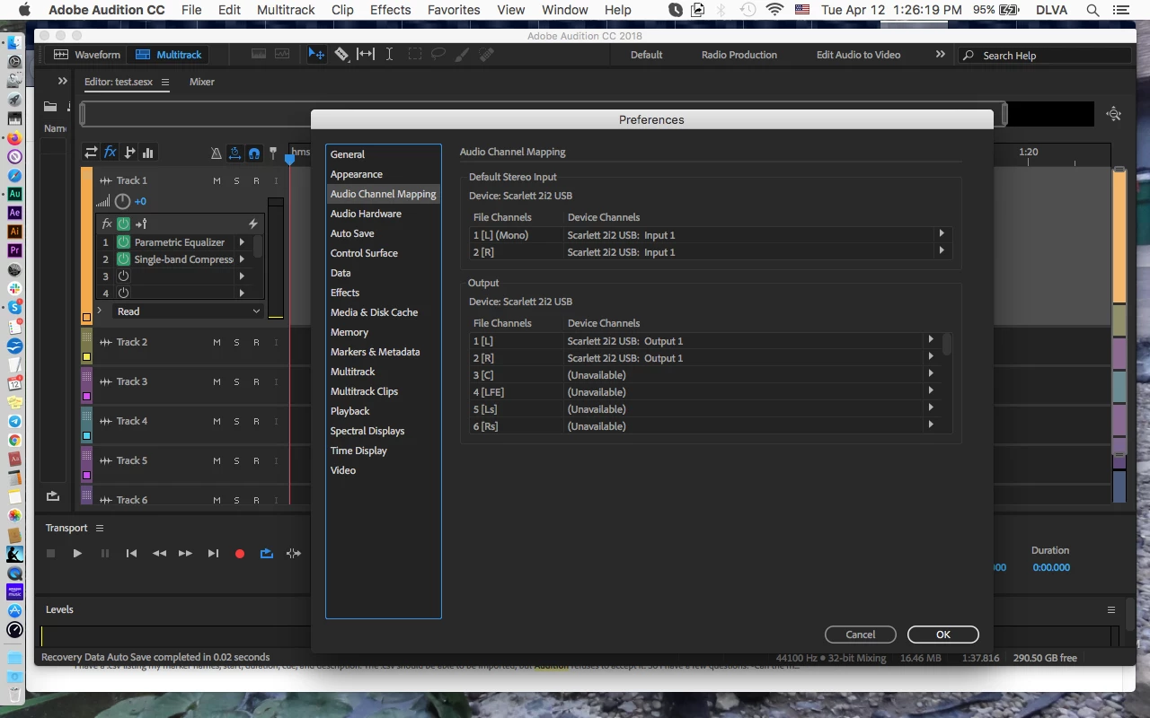 Both channels are set to Scarlett 2i2 USB: Input 1 in Audio Channel Mapping. Default Input is Scarlett 2i2 USB in Audio Hardware. Inputs/Outputs is set to Scarlett 2i2 USB Input 1. (Screenshots attached.)