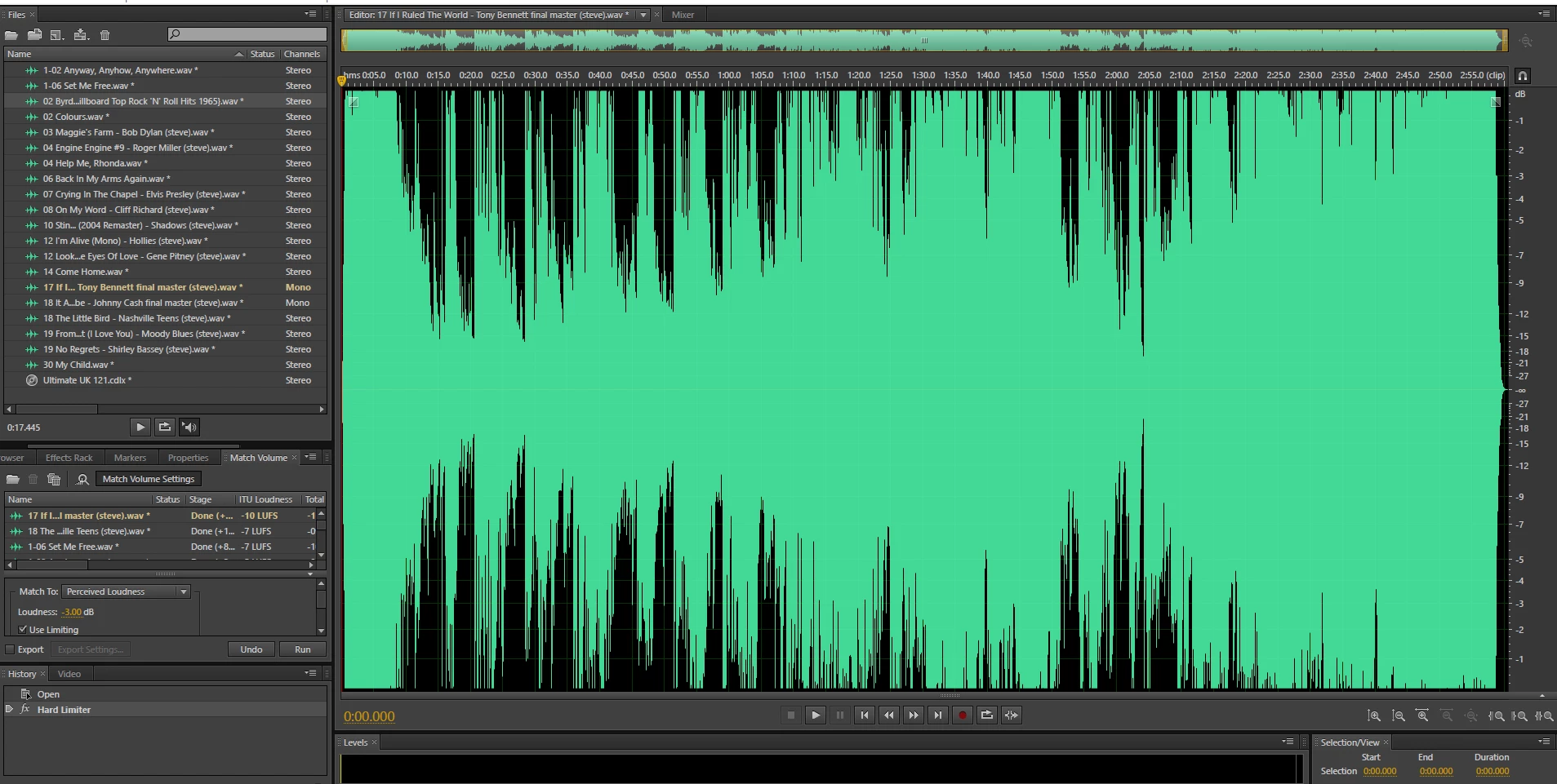 I have been ripping songs from CDs and transferring them into Audition and also burning CDRs via Audition. I started normalising these songs to -3db via the 'Favourites' function. I soon noticed that the loudest part of a song (maybe a loud snare drum beat) would be identified and used as the reference point. The problem with that is apart from snare drum the remainder of the song could be considerably quieter than that which also gave overall inconsistency across all the other songs on the CDR. I had a quick browse on You Tube regarding normalisation and one website recommended 'perceived loudness' for more consistent sound across several songs. I tried this and I'm happy all the songs sound relatively the same volumewise.